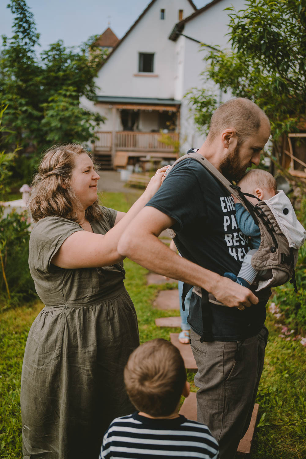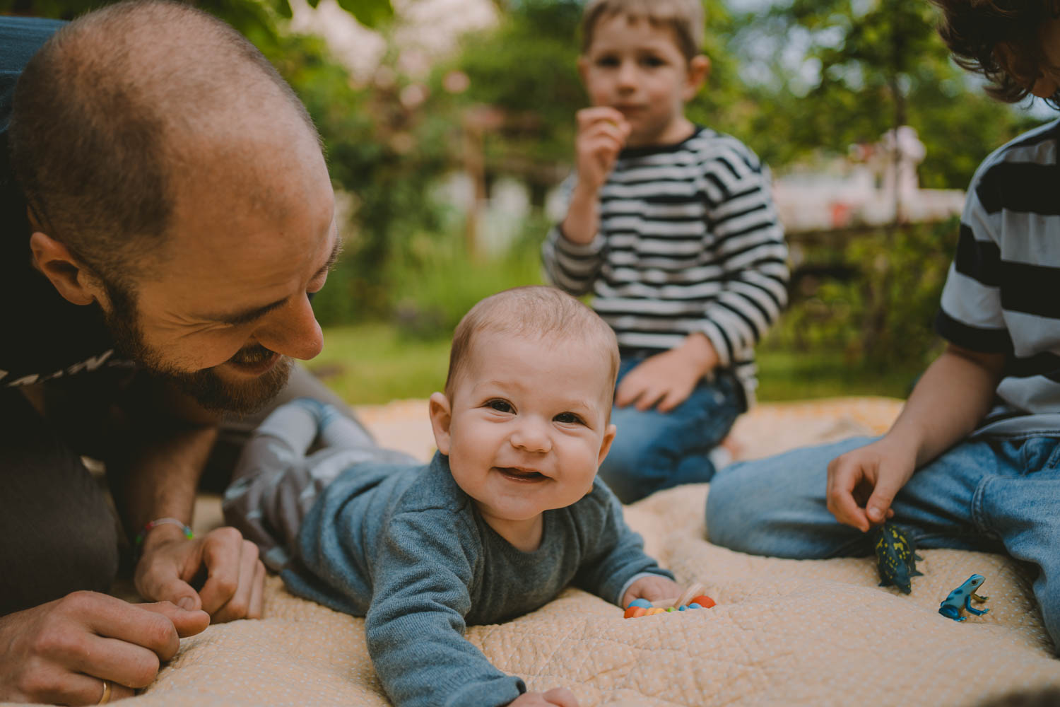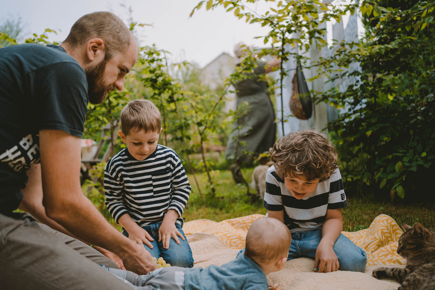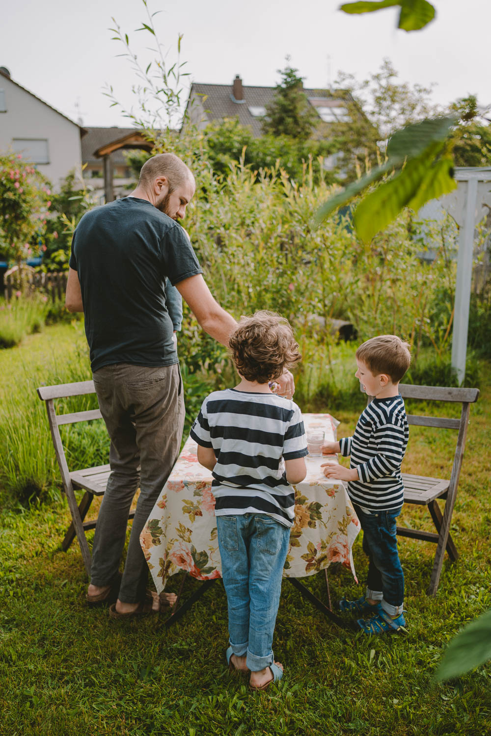 Vater mit Söhnen im Garten, dokumentarische Familienfotografie