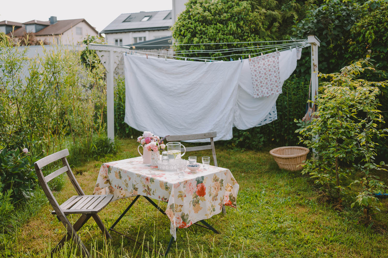 Frau beim Wäsche aufhängen, dokumentiert bei Familienreportage in Elsenfeld